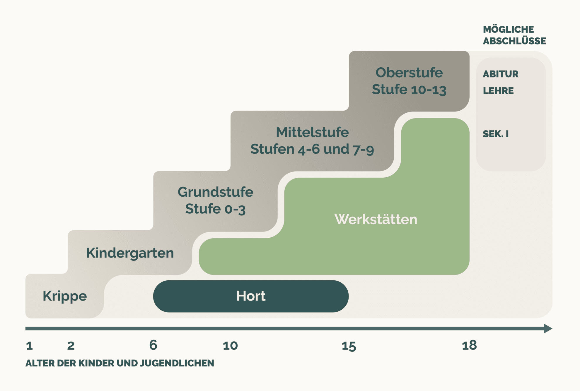 Je nach individueller Entwicklung können die Kinder und Jugendlichen in diesen Stufen zwei, drei oder vier Jahre verweilen, bevor sie in die nächste Stufe wechseln. So wird die Beschämung vor einem Sitzenbleiben vermieden, die Kinder lernen in den Stufen zu einem großen Teil von- und miteinander.